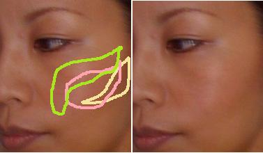 それで チークボーン、 鼻筋、 眉の上を